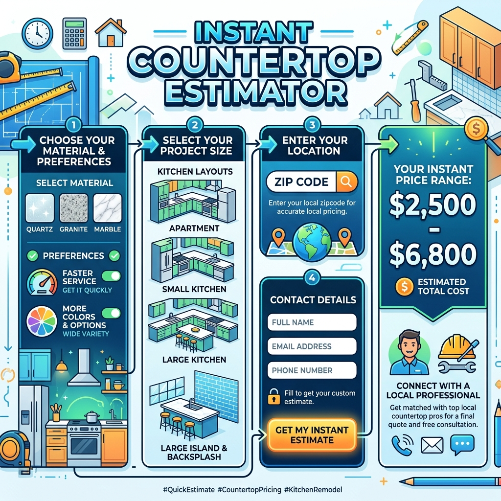 The Instant Countertop estimator Application on your website or link to from social media, Lead capture, instant Email notification of a new estimate, reporting app detailing your specific application